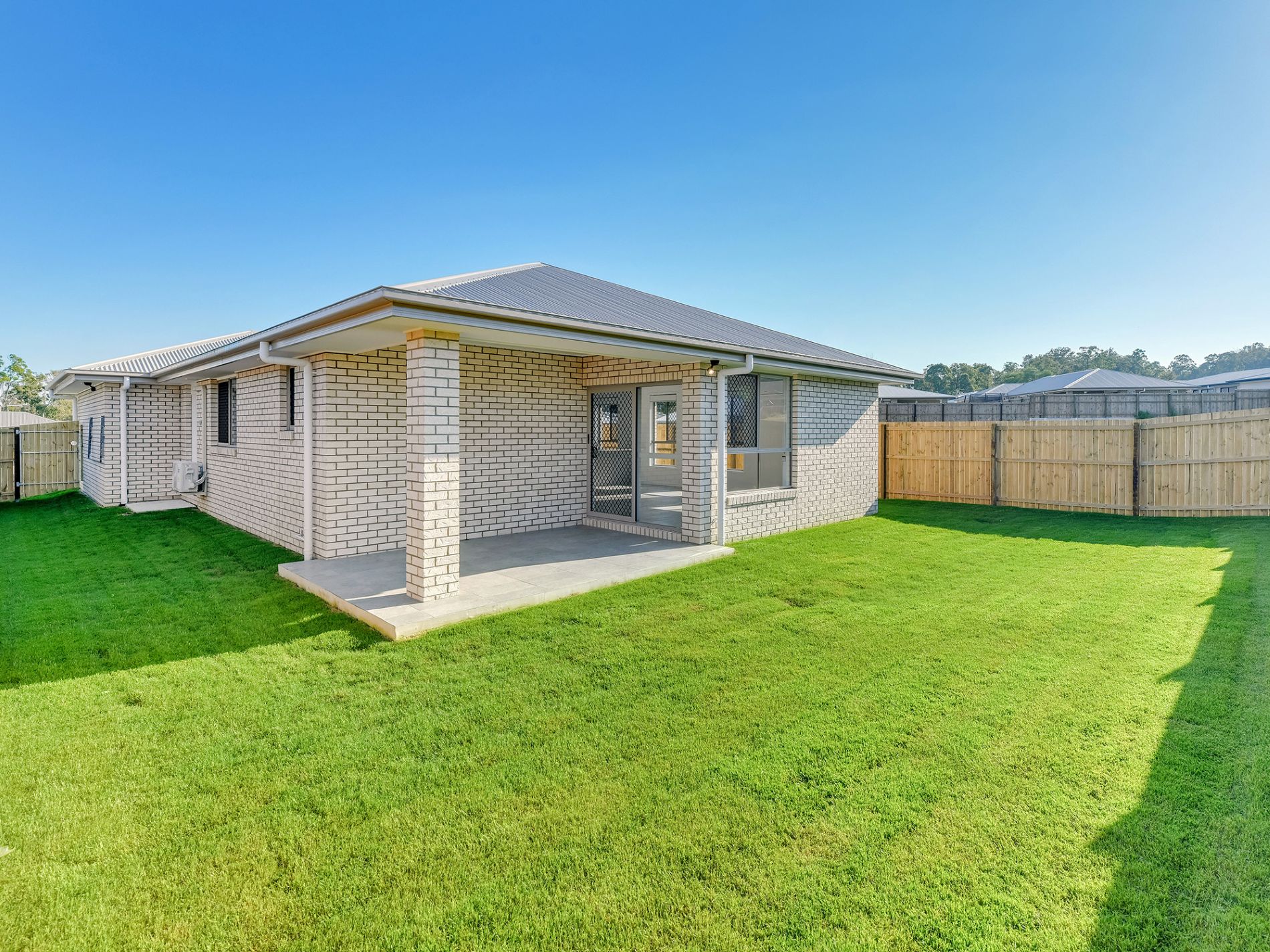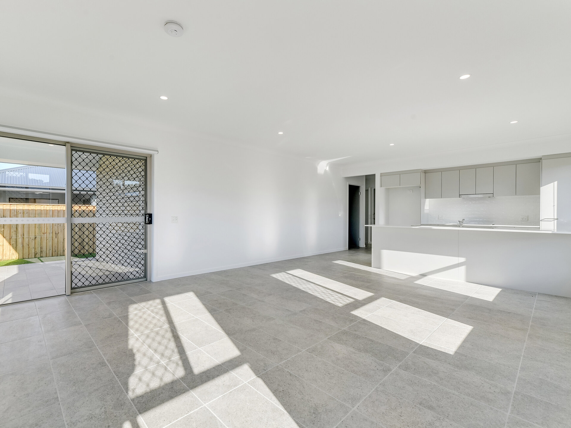 The main living area is open plan, with a comfortable sofa, large screen television, and direct access to a covered patio and private back yard.