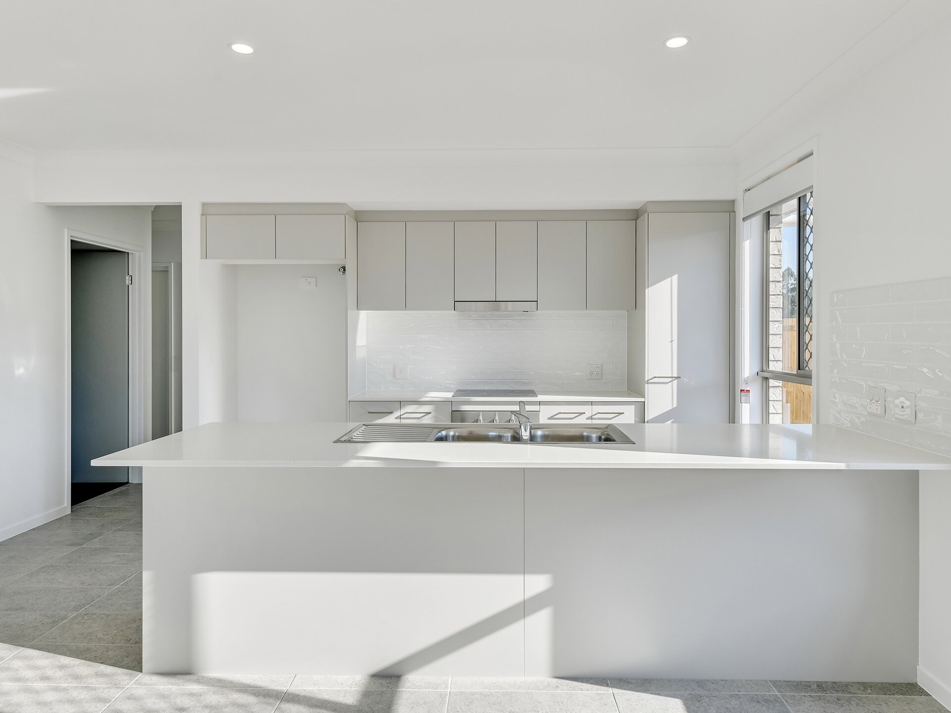 - Modern kitchen with height-adjustable bench top, dish drawer dishwasher, Caesarstone benchtops, strip lighting in overhead cupboards, bright natural lighting
