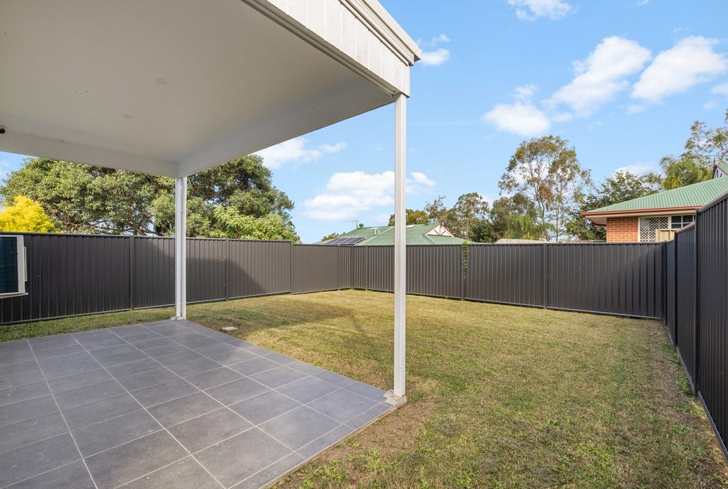 The main living area is open plan, with direct access to a covered patio and private backyard.